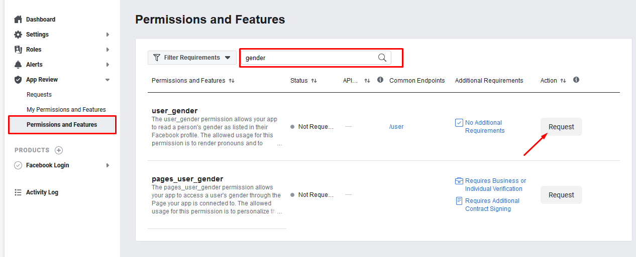 If you are using Age Group and Gender in Logic quizzes you will need to request both permissions from Facebook and get them approved in order to use them. To do that please go to App Review > Permissions and Features search for “user_gender”and click Request button and similarly search for “user_age_range” and click Request. For both new permissions Facebook require you to provide how app will use both permissions and you will have to provide a test case and/or video where you need to show how app use both permissions.