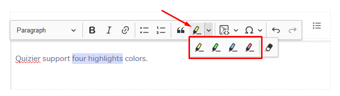 Write your text and then highlight whatever you want to be highlights. Then click on the marker icon in the toolbar that appears at the top of the text box. Quizier support four highlights colors.